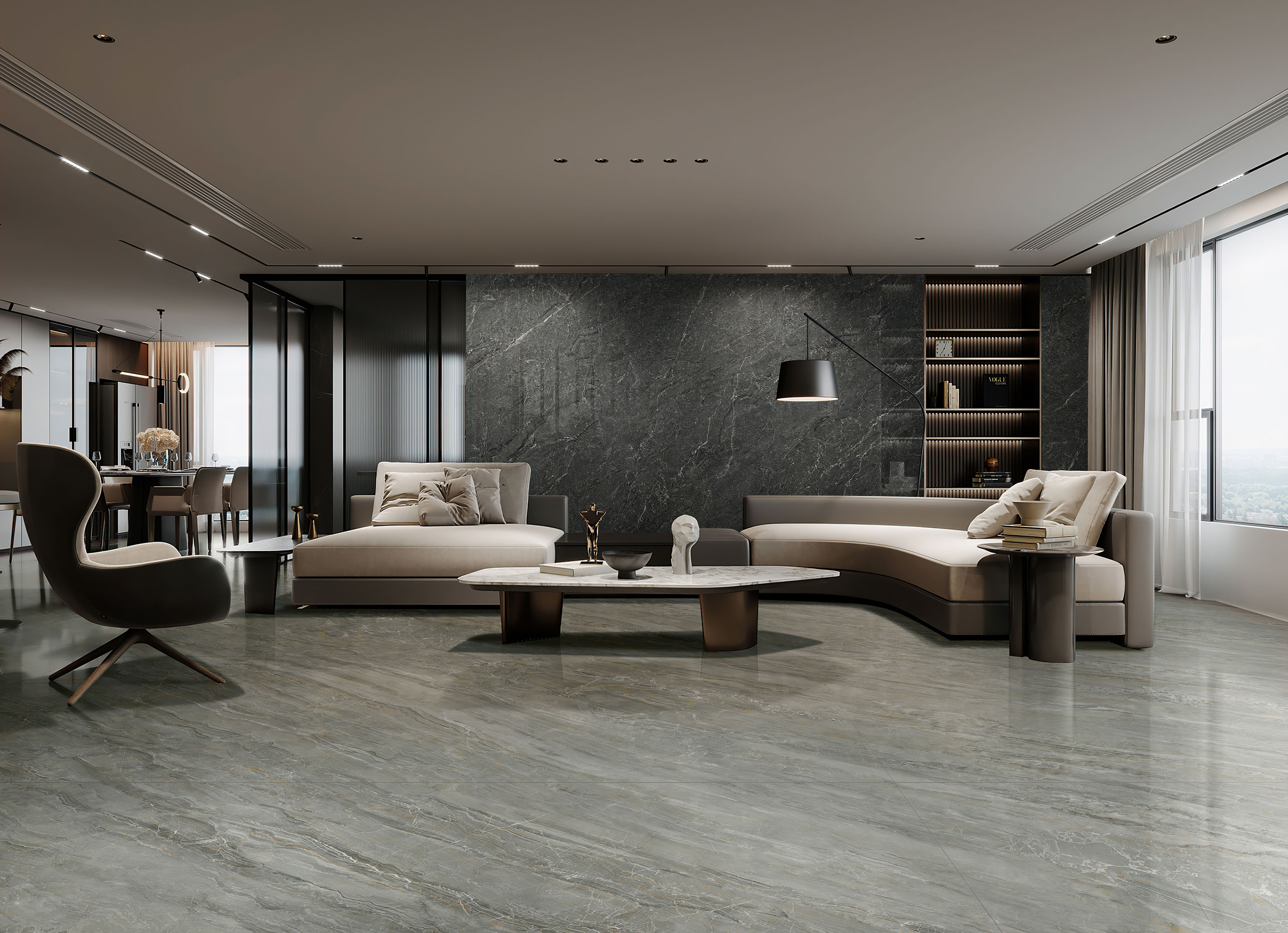 灵感源于意大利名贵珍稀大理石。以意大利名贵大理石材为蓝本,不规格白色纹理自然分布于深灰色砖面,层次分明,散发高级沉稳的天然神韵。多重创新工艺叠加,表面呈现30°原石光感,触感温润,尽显自然格调。超大规格1200x2400mm,4面任意无限连纹设计,打破空间局限,造就高端居所。
